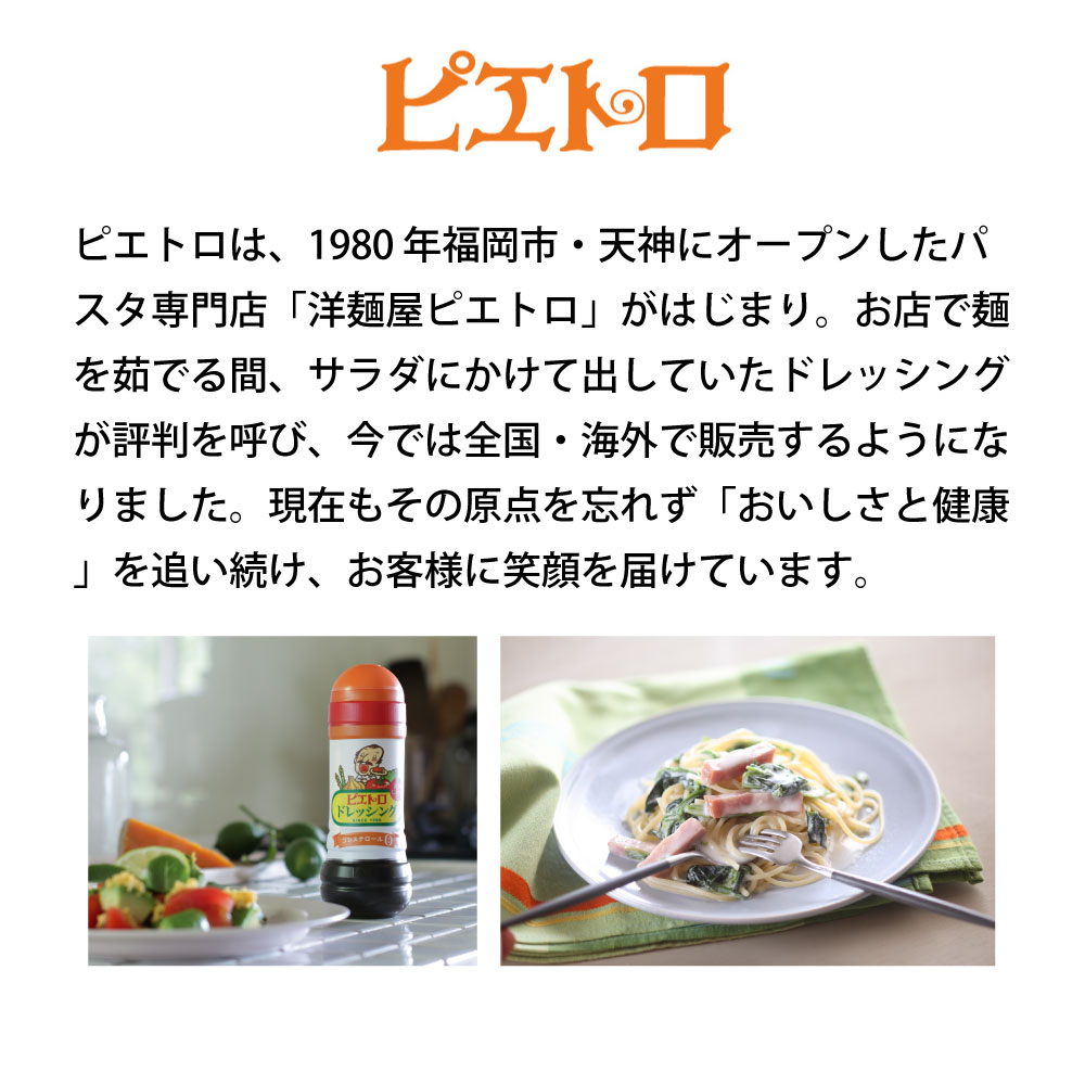 ピエトロは、1980 年福岡市・天神に創業したスパゲティレストラン「洋麺屋ピエトロ」がはじまり。創業してまもなく、店で出したしょうゆベースの和風ドレッシングが評判を呼び、今では全国で発売されるようになりました。現在もその原点を忘れず「おいしさと健康」を追い続け、お客様に笑顔を届けています。