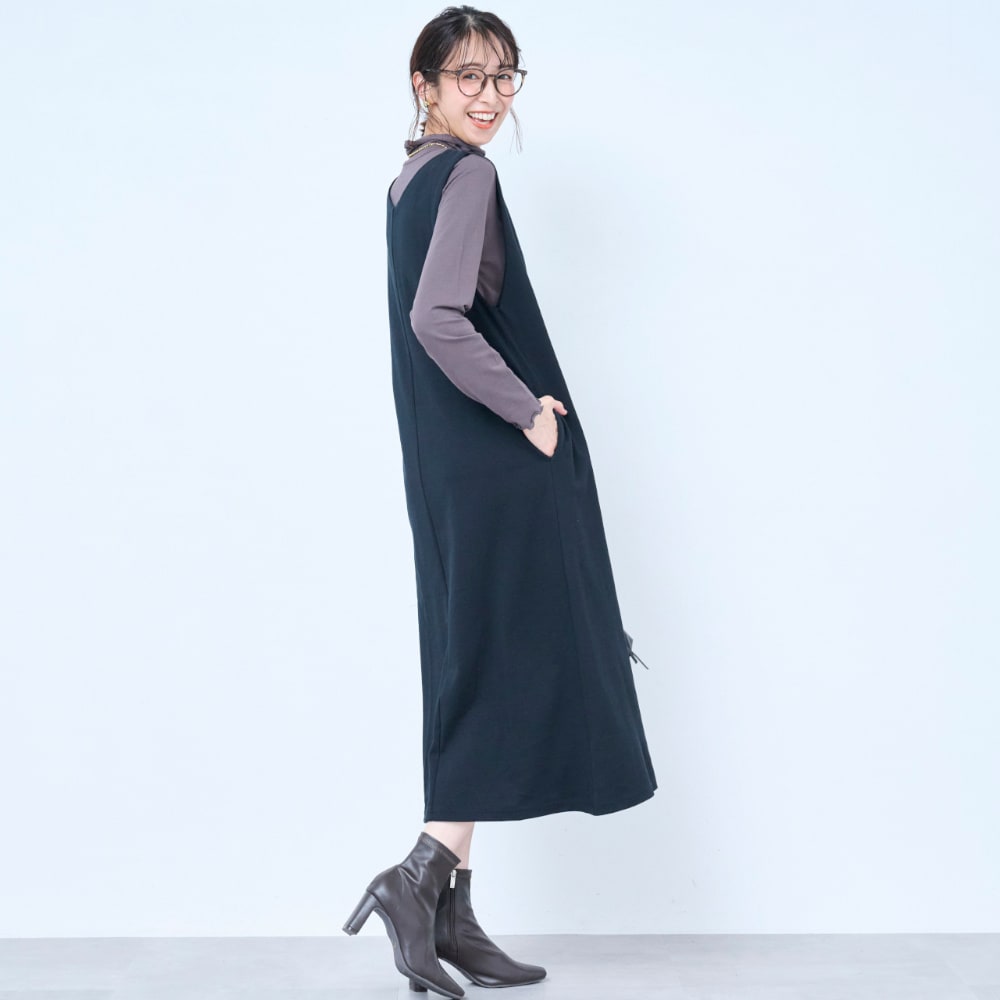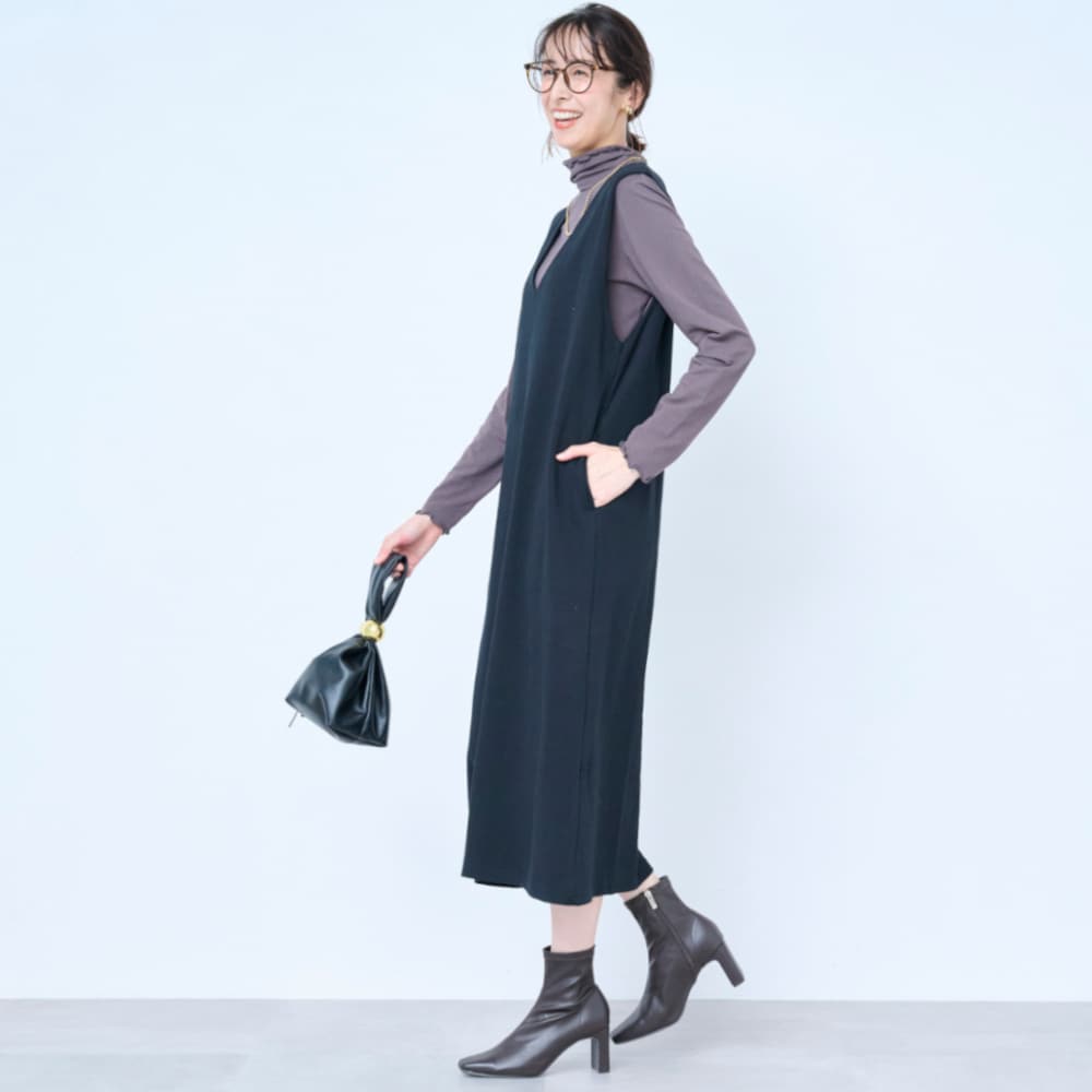 トップスを調節すれば季節問わず着られそうです。ゆったり着られるのに、ワンピースでキレイめに見せれるというのがいいですね。色違いも欲しいです。