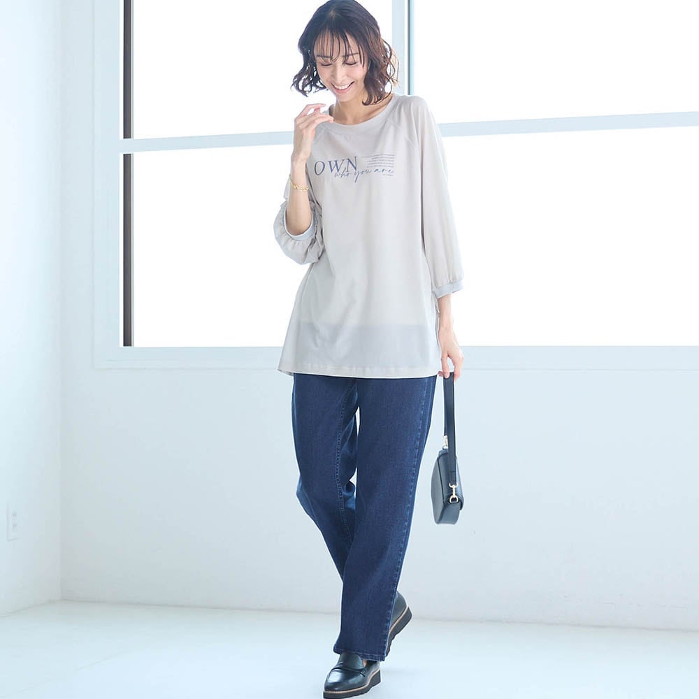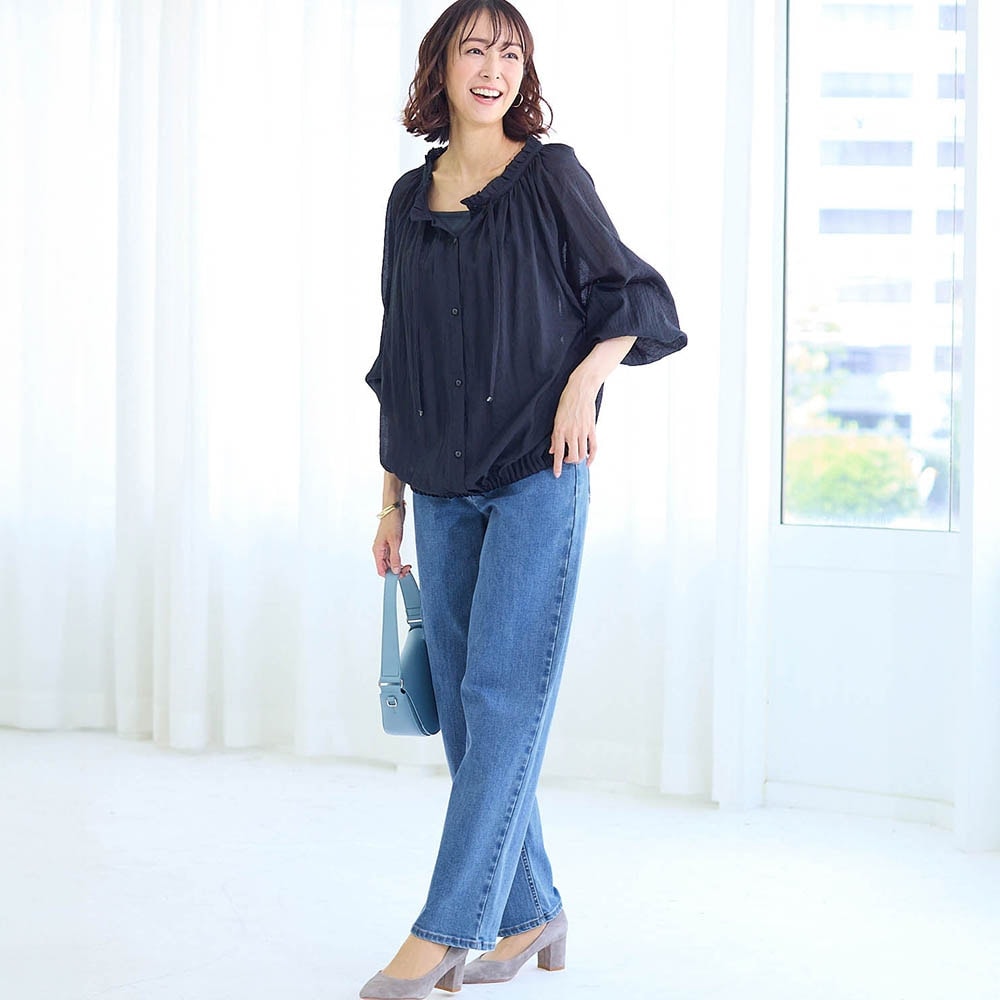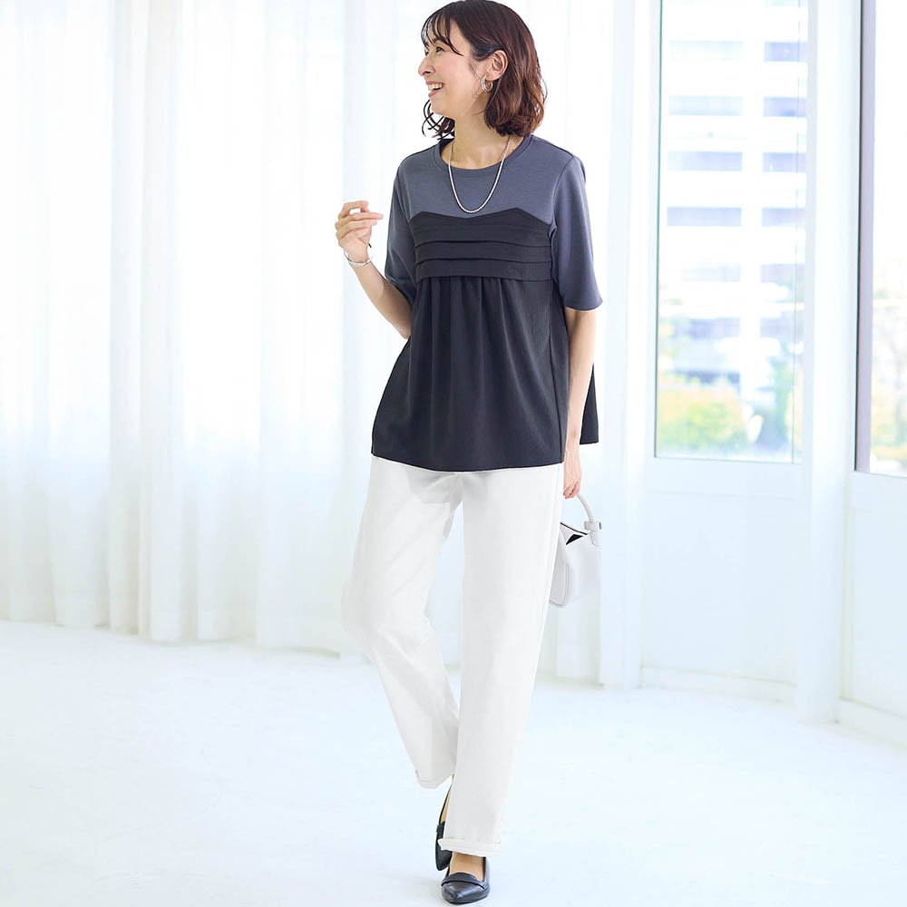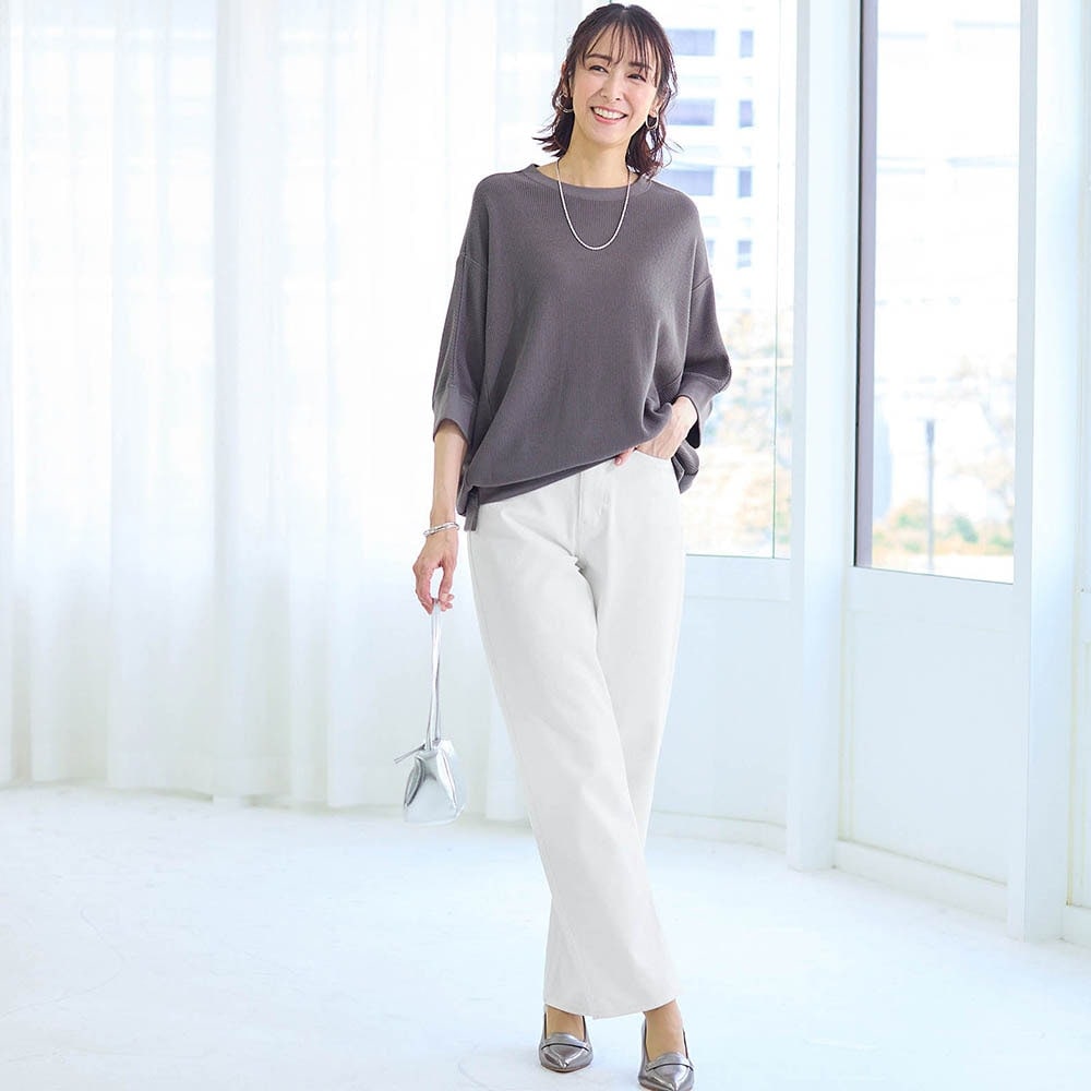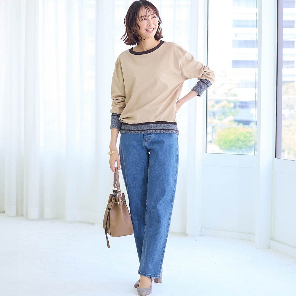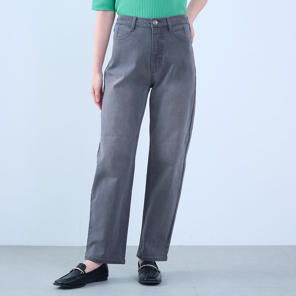 太もも部分はゆったりで着痩せはしませんが太っても見えず 楽チン、ヒップはポケットでスッキリ見えると思います。