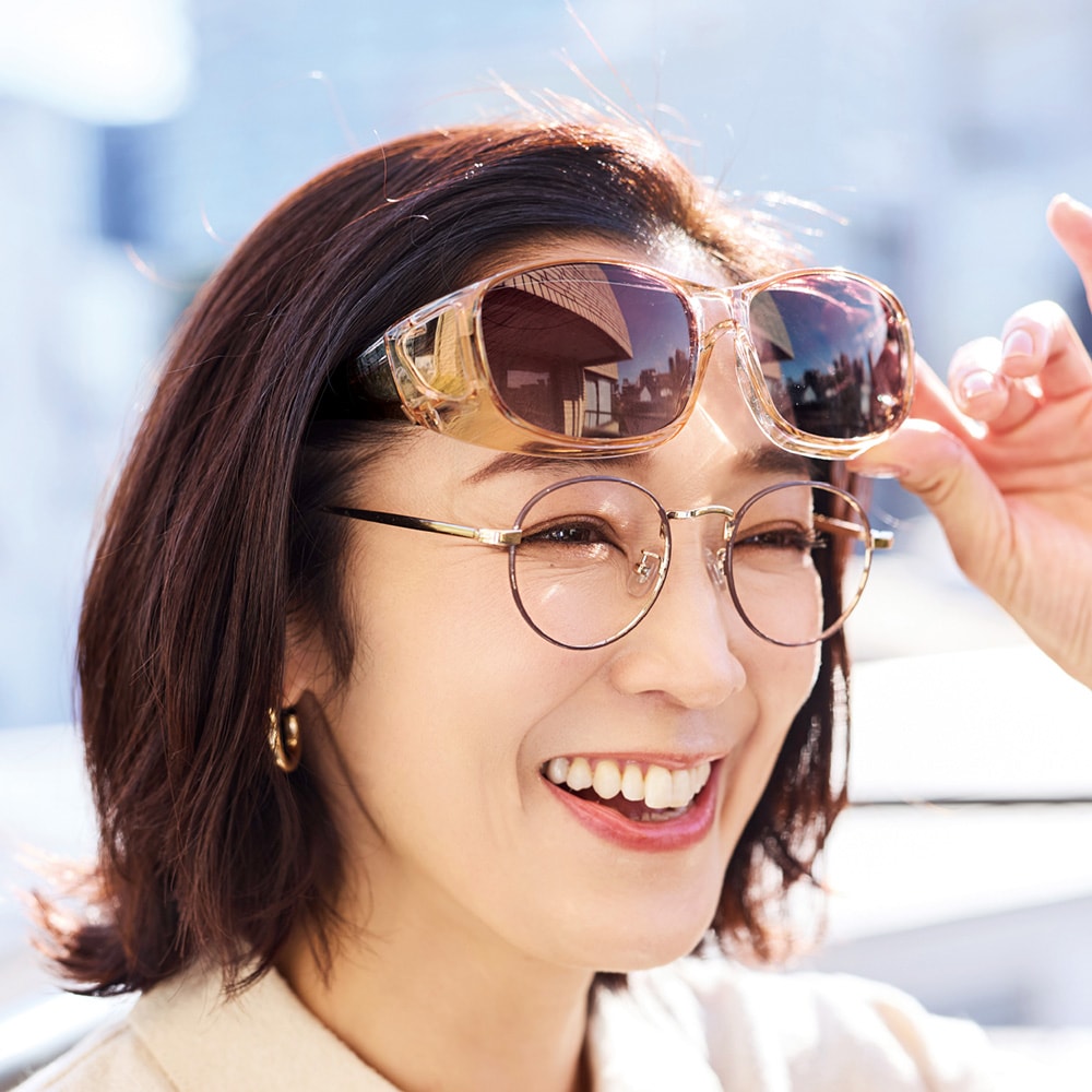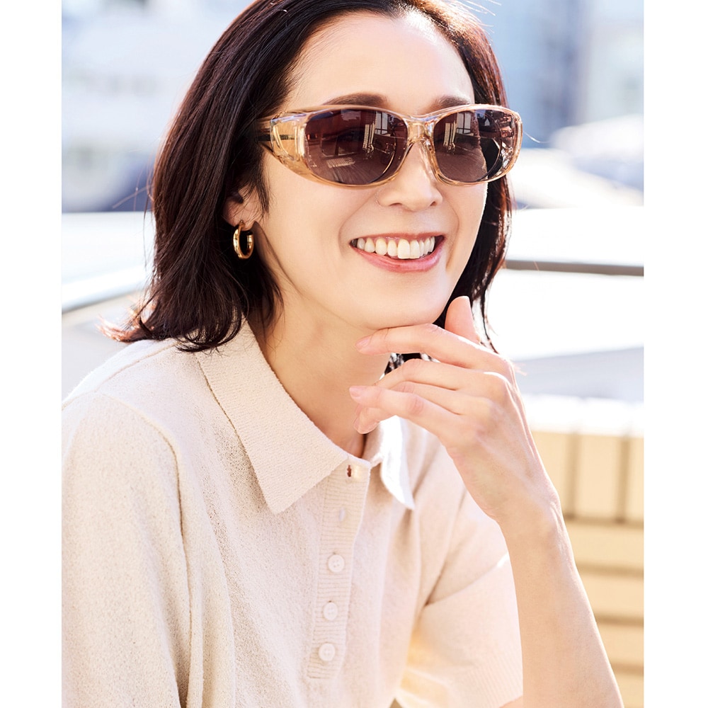 サングラスの枠の大きさ、レンズの濃淡具合、下にかけているメガネがあまり目立たないところが気に入っている。今夏、大いに役立ちそう!