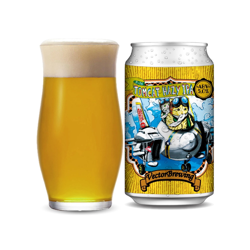 【トムキャットヘイジー IPA】スタイルは香り最高のHAZYIPA!イラストのモチーフはF14戦闘機(通称トムキャット)。特徴の「可変翼」によって実現される速度はマッハ2.5kmビールでこのマッハの速度を表現したことで、高速でジューシーなアロマが飛び込んでくるかのように感じます。飲み口の良さと苦味のタンデムをお楽しみください!
