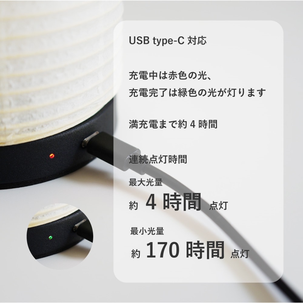 ●充電式/約4時間充電で最大光量で約4時間点灯、最小光量で約170時間点灯