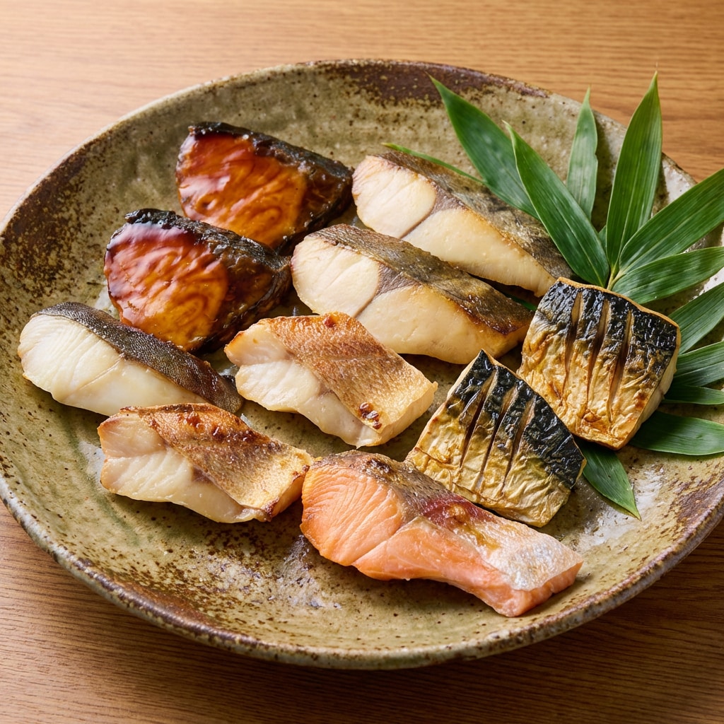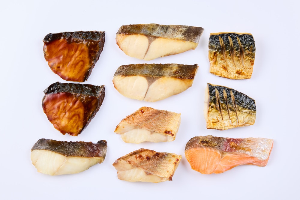 ●銀だら西京焼、サーモントラウト塩焼 各1切、めぬけ西京焼、さば塩焼、、ぶり照焼、銀ひらす西京焼 各2切