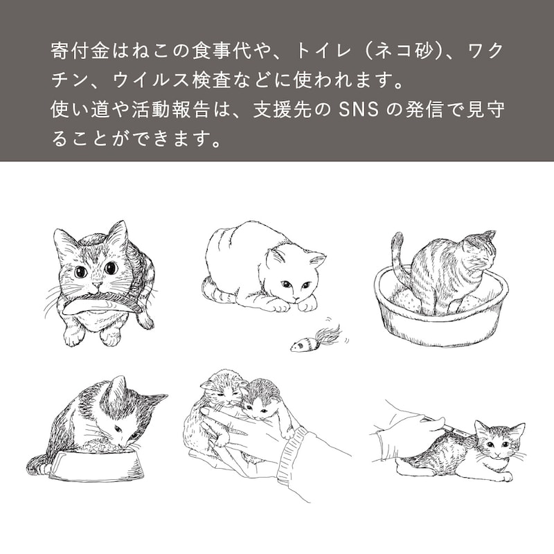 寄付金はお客様が選んだ支援先である保護施設へ贈られ、猫の救済や生活費などに使われます。
