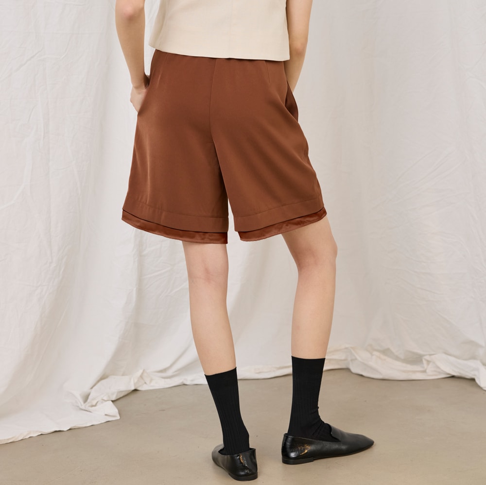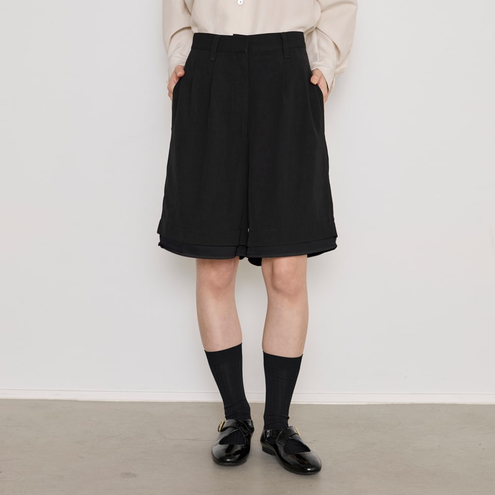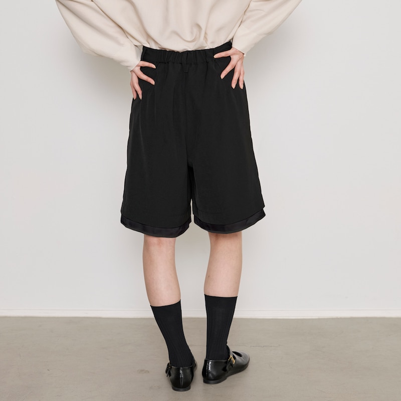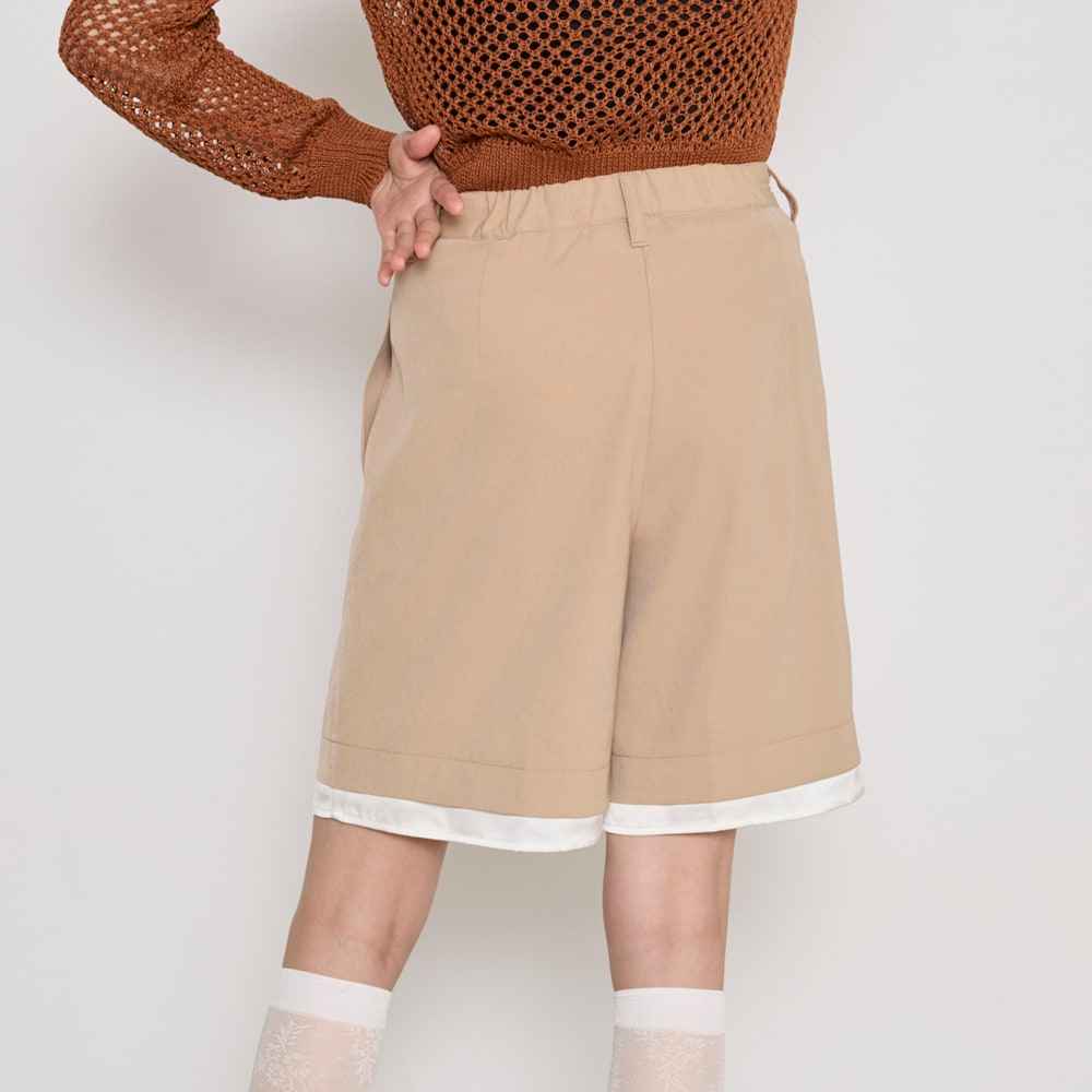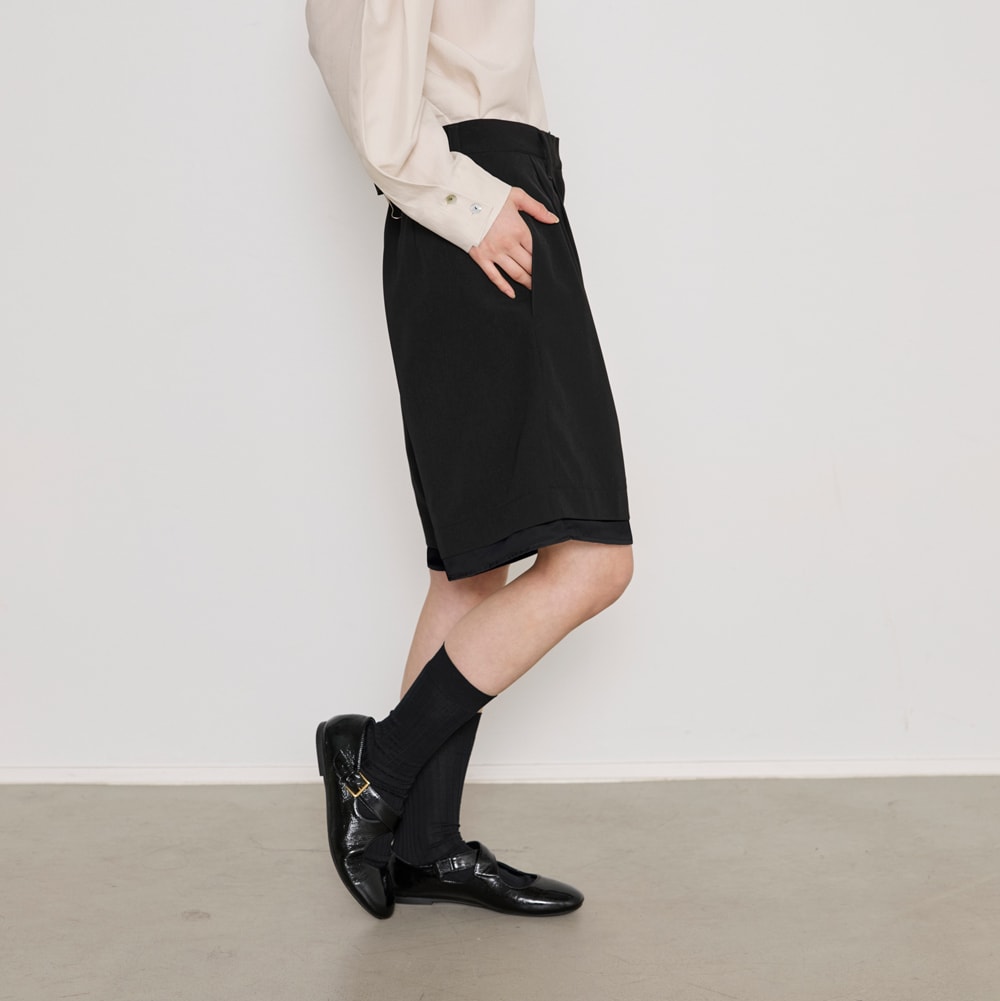 裾に重ねたサテンで、ショーツに奥行きを。きれいめに穿ける膝丈デザイン