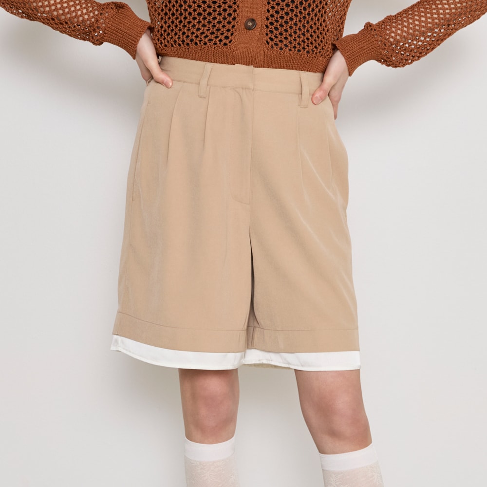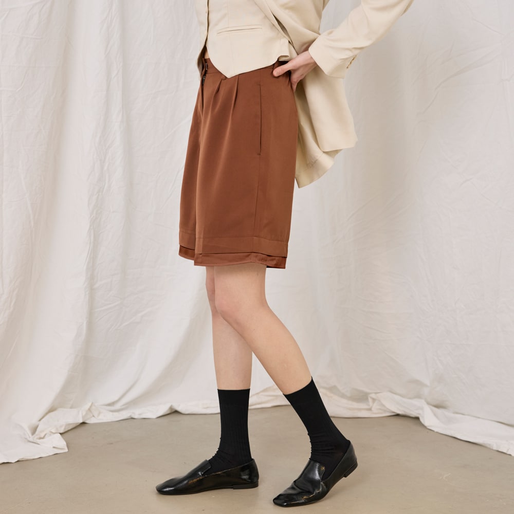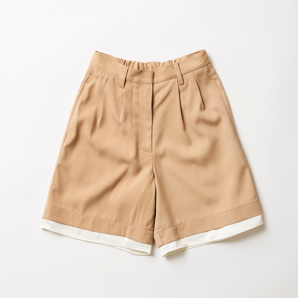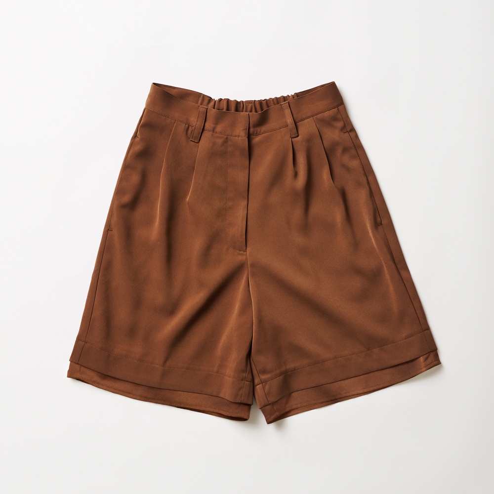 裾に重ねたサテンで、ショーツに奥行きを。きれいめに穿ける膝丈デザイン