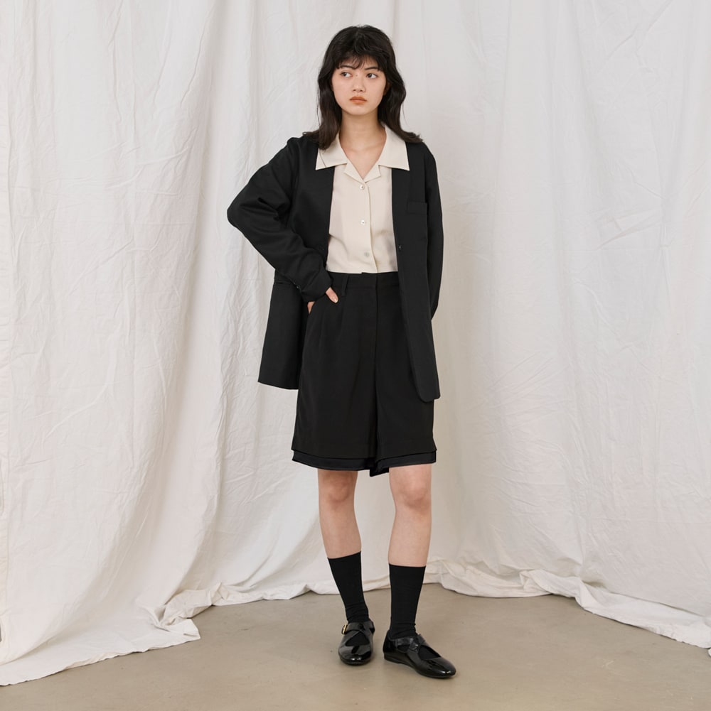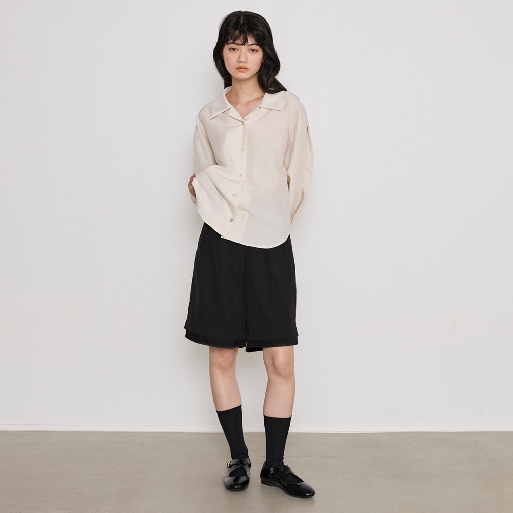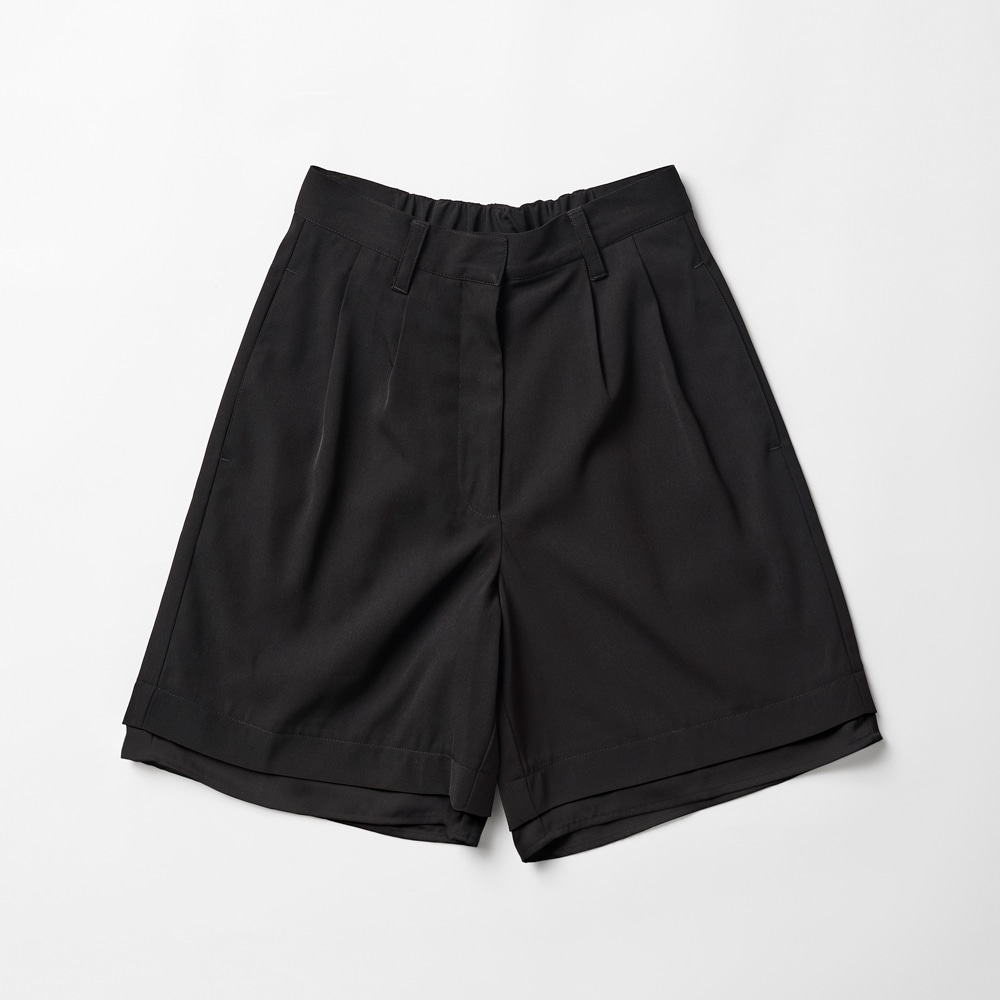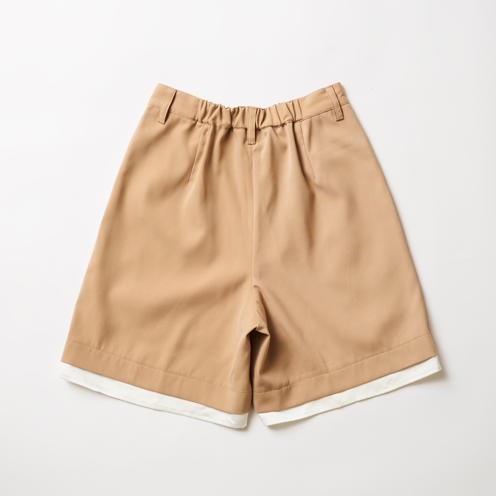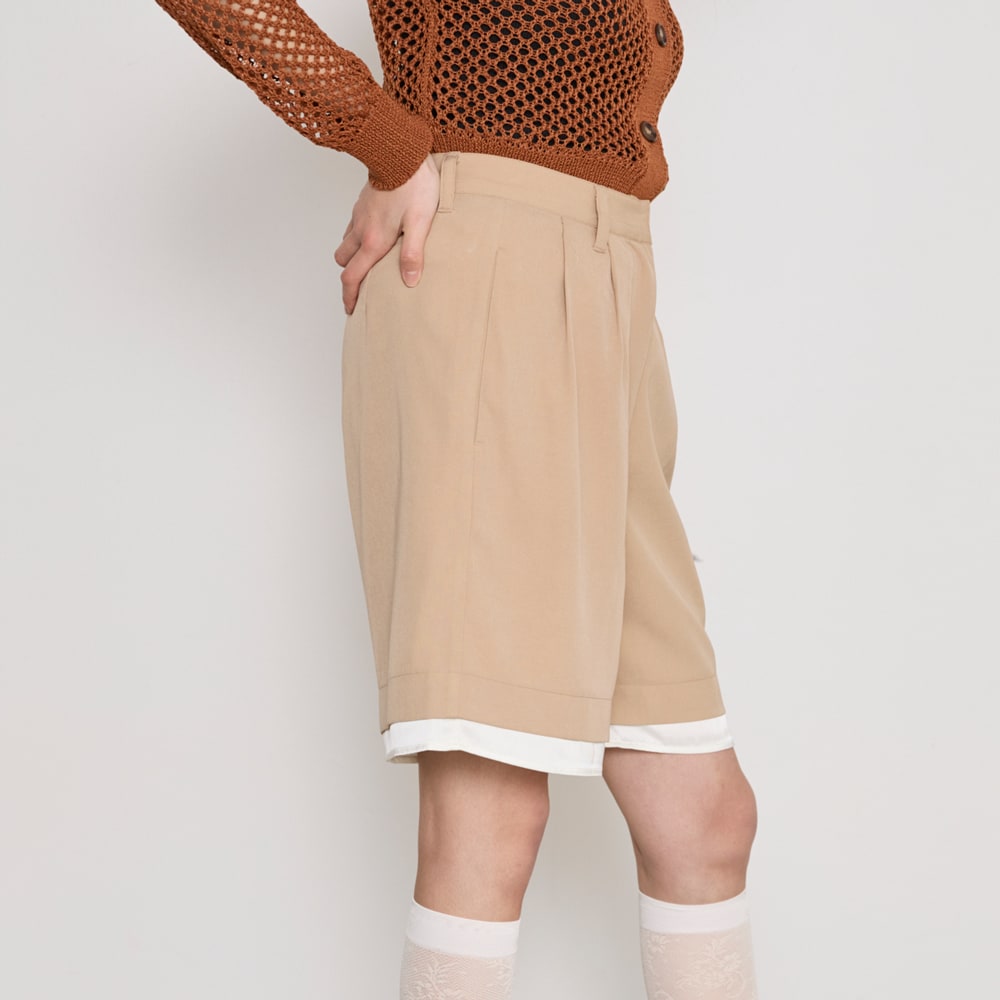 裾に重ねたサテンで、ショーツに奥行きを。きれいめに穿ける膝丈デザイン