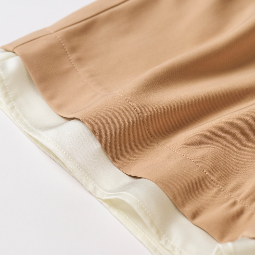 異素材のサテン生地を裾からのぞかせたレイヤード風